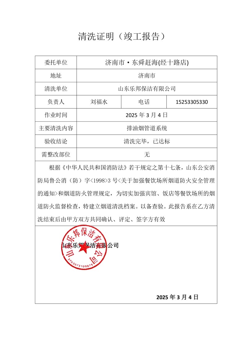 濟(jì)南市·東舜趕海(經(jīng)十路店)清洗報(bào)告25.3.4