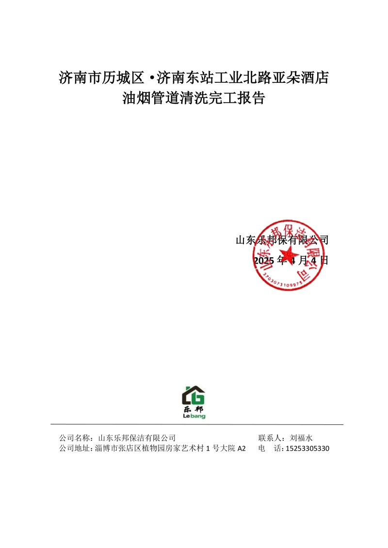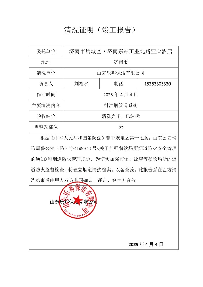 濟南市歷城區·濟南東站工業北路亞朵酒店清洗報告25.4.4