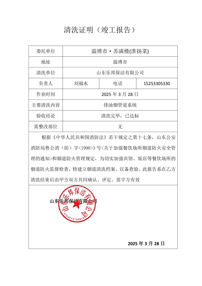 淄博市·蘇滿樓(淮揚菜)清洗報告25.3.28