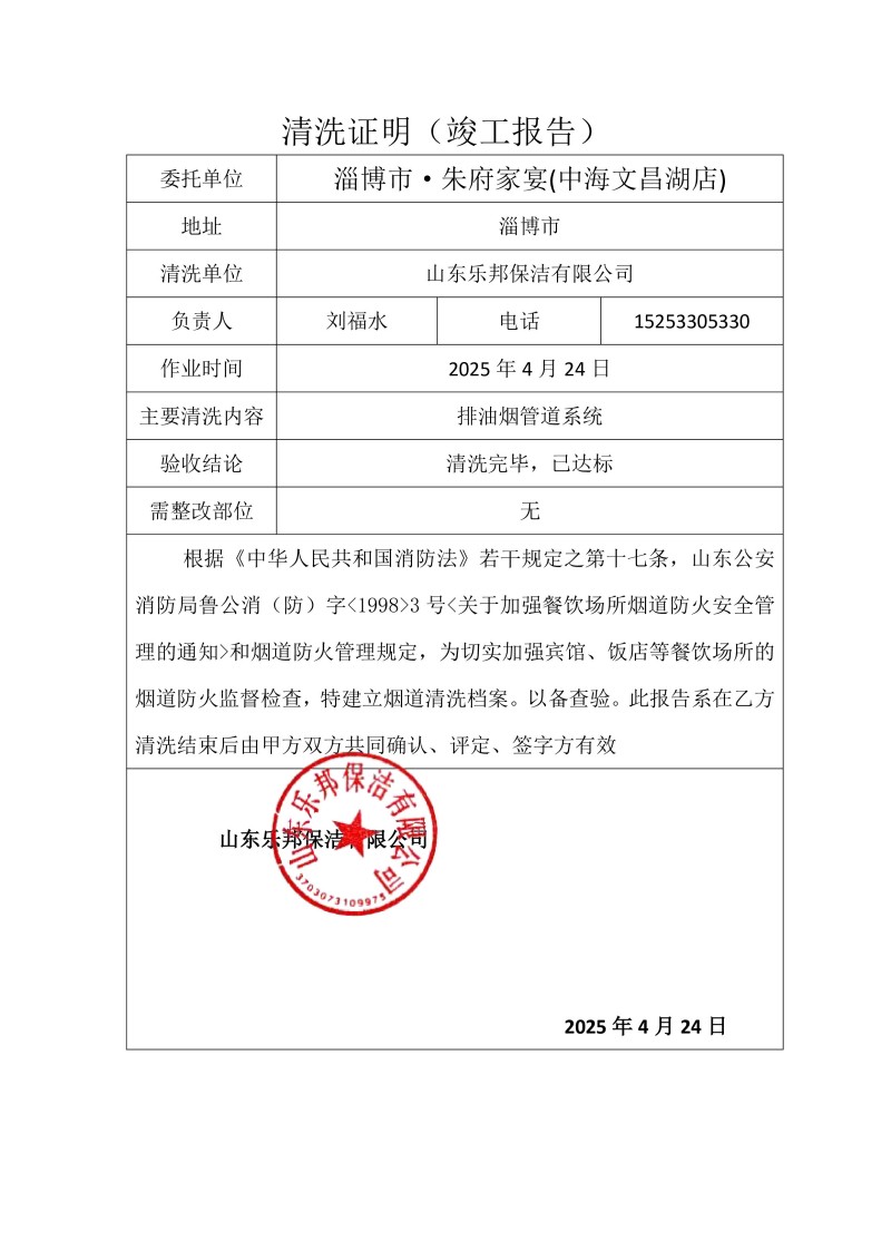 淄博市·朱府家宴(中海文昌湖店)清洗報告25.4.24