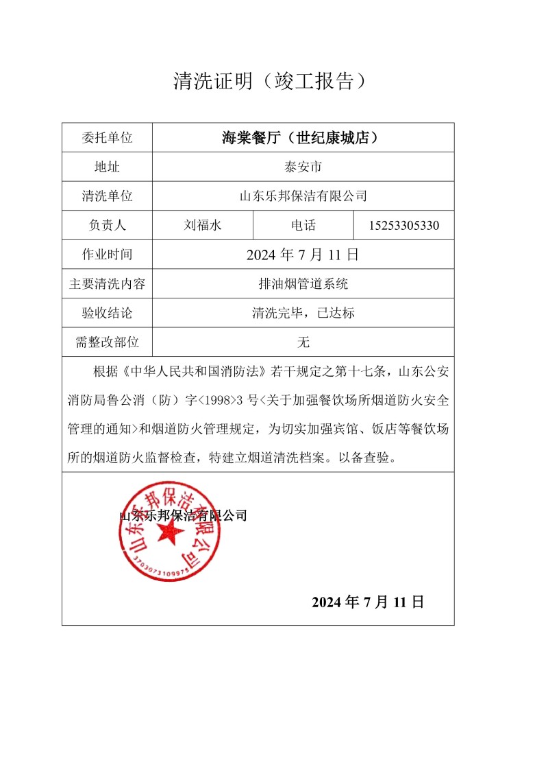 海棠餐廳(長城路店)清洗報(bào)告24.7.10
