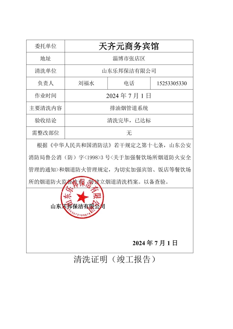 天齊元商務賓館清洗報告24.7.3