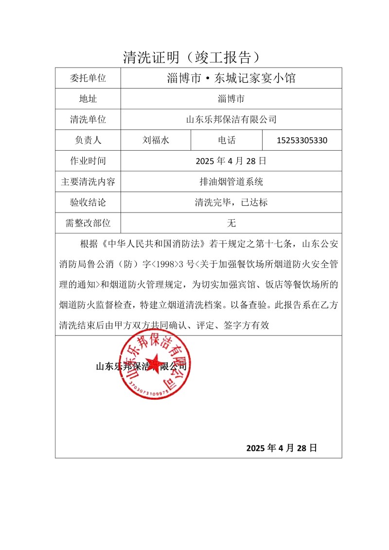 淄博市·東城記家宴小館清洗報(bào)告25.4.28