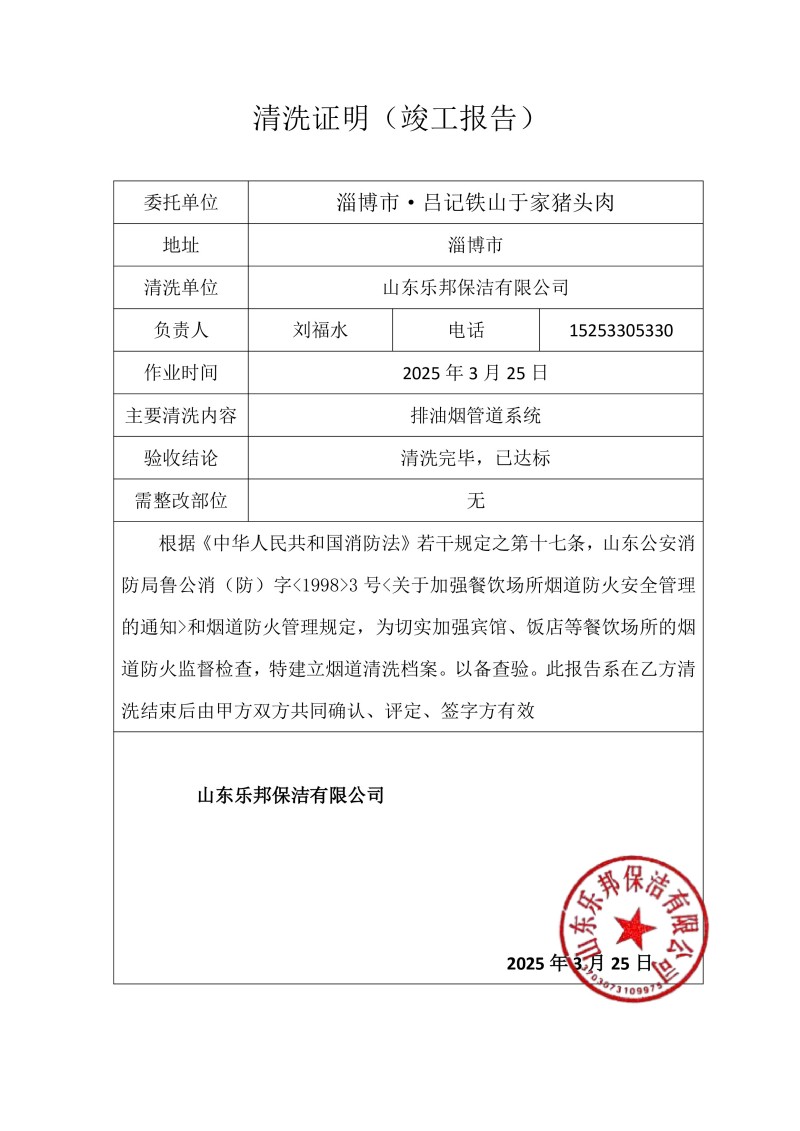 淄博市·呂記鐵山于家豬頭肉清洗報告25.3.25