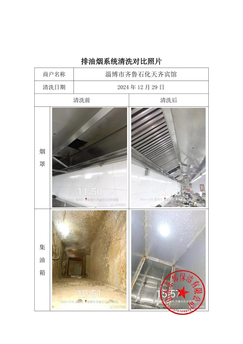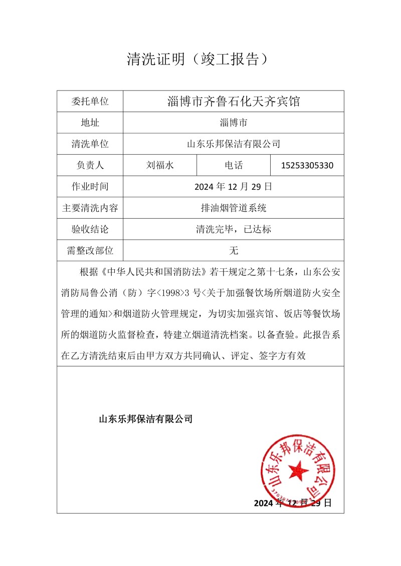 淄博市齊魯石化天齊賓館清洗報告24.12.29