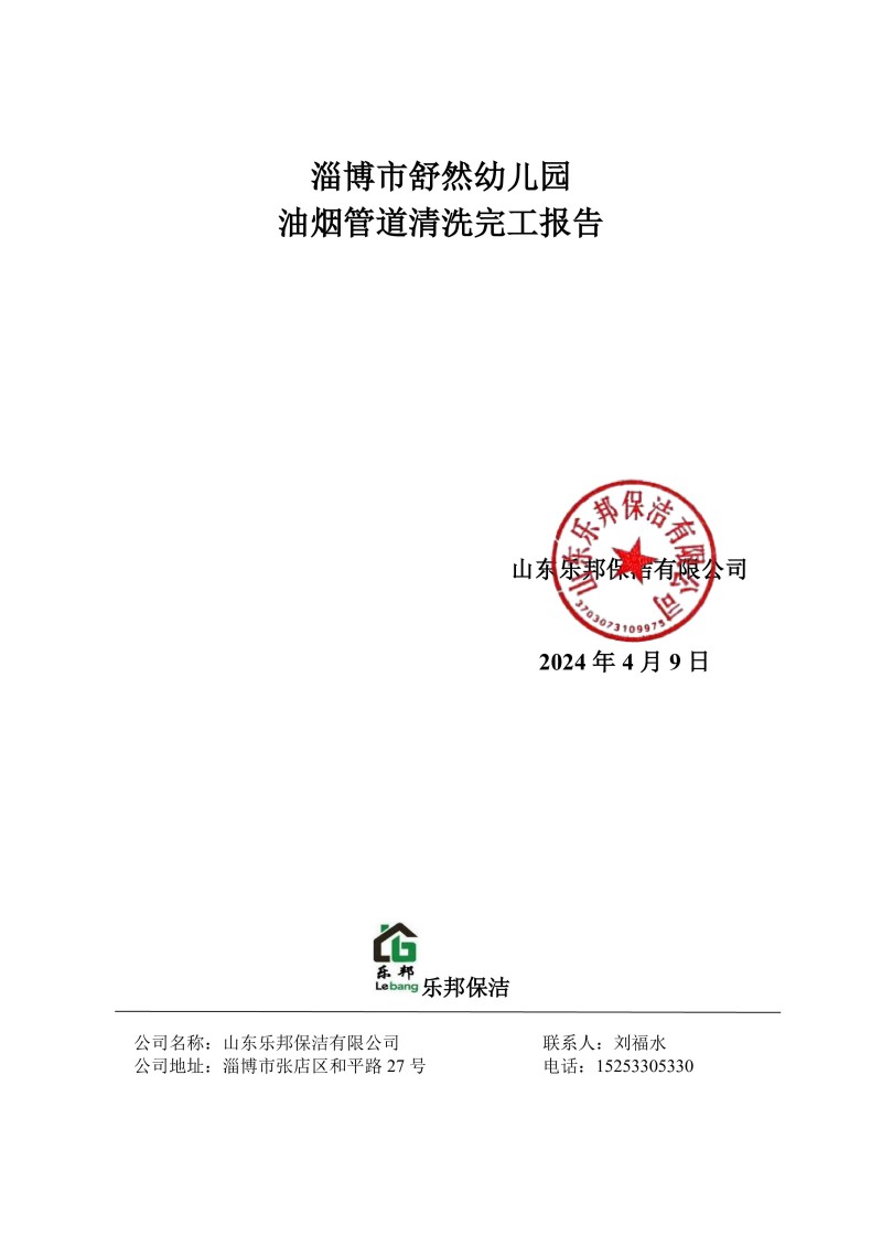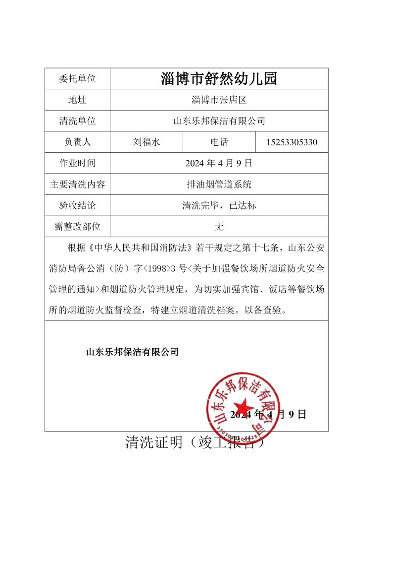 淄博市舒然幼兒園清洗報告24.4.9