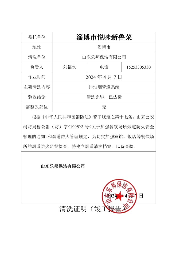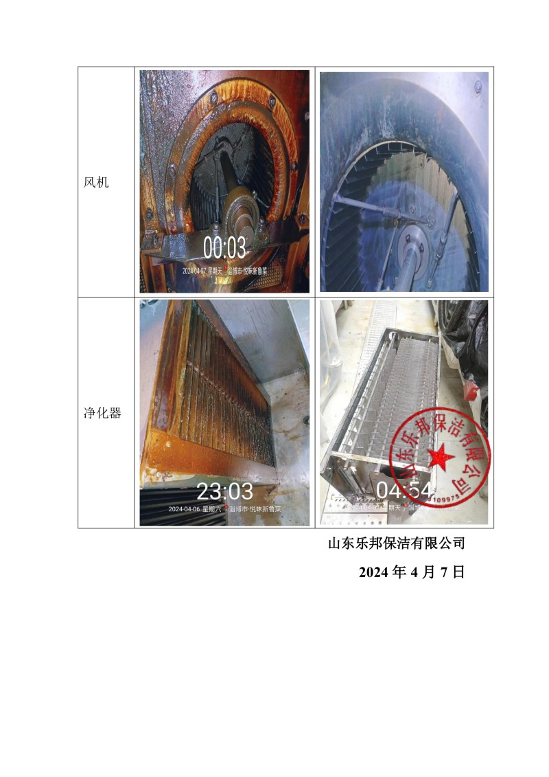 淄博市悅味新魯菜清洗報(bào)告24.4.7